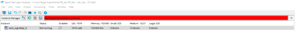 Moduł odpowiedzialny za zbieranie i przechowywanie danych, zbudowany jest z tych samych zasobów co badana logika, przez co projekt wraz z dodatkowymi elementami powiększy się. Nie będzie to dokładnie nasz projekt, ponieważ po dołożeniu dodatkowych elementów, konieczna jest powtórna synteza, a co za tym idzie, rozłożenie logiki w strukturze układu FPGA zostanie wykonane ponownie. Może to skutkować zniknięciem pewnych amonali, które chcieliśmy wytropić, choć nie powinno się to często zdarzać. Pomimo niedogodności jest to przydatna metoda debugowania, pozwalająca przynajmniej częściowo zajrzeć do środka układu.