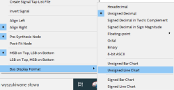 Zgodnie z oczekiwaniem, wartości w pierwszych czterech liniach nie ulegają zmianie, ponieważ są one ściśle związane z ustawionym przez nas warunkiem. Najciekawszy jest ostatni wiersz, zawierający wyniki pomiarów. Widzimy, że wartości zmieniają się bardzo często. Aby wynik był czytelniejszy, możemy zmienić tryb wyświetlania na graficzny. W tym celu, tak jak przy zmianie sposobu interpretacji danych, klikamy nazwę sygnału prawym przyciskiem myszy. Z menu kontekstowego, przedstawionego na rysunku 25, wybieramy opcję Bus Display Format, a następnie Unsigned Line Chart (wykres liniowy dla liczb bez znaku).