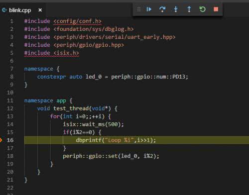 Potrafimy już kompilować oraz programować pamięć Flash mikrokontrolera, na koniec pokażemy, jak w prosty i wygodny sposób można debugować oprogramowanie. Załóżmy, że chcemy sprawdzić zawartość zmiennej lokalnej i w funkcji test_thread(). Aby tego dokonać, klikamy lewym klawiszem myszy w edytorze tuż za numerem wybranej linii, co spowoduje ustawienie pułapki (breakpoint). Teraz wystarczy wywołać menu debuggera, wciskając klawisz CTRL+D oraz wcisnąć przycisk zielonej strzałki w prawym górnym rogu, co spowoduje uruchomienie debugowania. Gdy program dotrze do wspomnianego punktu zatrzymania, linia, w której postawiono pułapkę, zostanie podświetlona. Wskazując myszką wybraną zmienną, możemy obejrzeć jej wartość (rysunek 11).