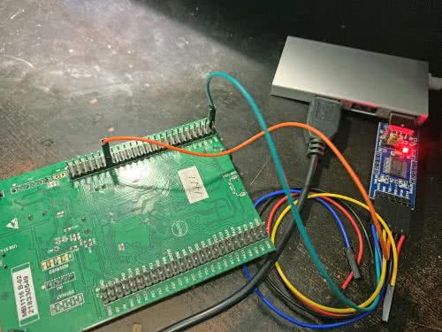 Układ należy połączyć z płytką ewaluacyjną za pomocą przewodów według konfiguracji pokazanej na fotografii 7 i w tabeli 1. Zestaw uruchomieniowy ma zintegrowany programator STLINKv2. Aby zaprogramować pamięć Flash, nie musimy mieć dedykowanego programatora. Wystarczy połączyć złącze CN1 zestawu z komputerem za pomocą przewodu USB Mini B → USB A.