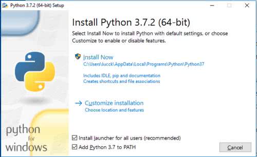 Instalację środowiska rozpoczynamy od pobrania interpretera języka python3, który dostępny jest pod adresem http://bit.ly/2Xg8ZQB. W zależności od posiadanej 32- lub 64-bitowej wersji Windows należy pobrać wersję „Windows x86 web based installer” lub „Windows x86_64 web based installer” oraz uruchomić instalator. Na ekranie konfiguracyjnym instalatora należy wybrać opcje jak na rysunku 1, a następnie kliknąć w przycisk „Install Now”.