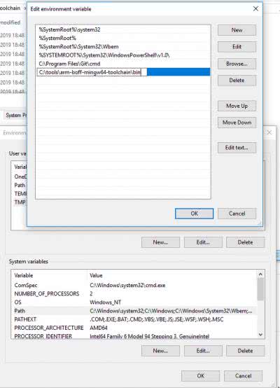 Aby zainstalować kompilator, rozpakowujemy wybraną wersję do katalogu c:\tools, a następnie dodajemy do zmiennej środowiskowej PATH katalog c:\tools\arm-boff-mingw32-toolchain\arm-none-eabi\ bin dla wersji 32-bitowej lub c:\tools\arm-boff-mingw64-toolchain\arm- none-eabi\bin dla wersji 64-bitowej. Aby to zrobić, należy kliknąć prawym klawiszem myszy na Mój komputer → Właściwości, wybrać zakładkę Ustawienia zaawansowane → Zmienne środowiskowe, zaznaczyć opcję Zmienne systemowe → Path, kliknąć w przycisk Edytuj → Nowy, a następnie wpisać wskazaną wcześniej ścieżkę (rysunek 3).