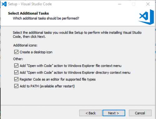 Ostatnim elementem, który będzie przydatny do pracy, jest samo środowisko Visual Studio Code, dostępne pod adresem http://bit.ly/2VhflNI. W zależności od preferencji możemy wybrać wersję instalatora, która zainstaluje VSCode w katalogu domowym lub wersję systemową, udostępniającą oprogramowanie dla wszystkich użytkowników. Podczas instalowania należy zaznaczyć wszystkie dodatkowe opcje (rysunek 4).