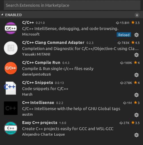 Po zakończonym procesie instalacji należy uruchomić VSCode oraz doinstalować dodatki niezbędne do pracy z kodem w języku C i C++. W tym celu po uruchomieniu środowiska należy wejść w zakładkę rozszerzenia za pomocą menu File → Preferences → Extension lub skrótu klawiszowego CTRL+SHIFT+X, a następnie za pomocą sklepu Marketplace zainstalować następujące dodatki (rysunek 5):