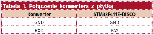 Konfiguracja sprzętowa. Ponieważ zestaw STM32F411E-DISCO nie ma wyprowadzonego portu szeregowego, umożliwiającego bezpośrednie dołączenie zestawu do komputera, musimy skorzystać z dodatkowej przejściówki RS232(TTL) → USB. Możemy wykorzystać dowolną przejściówkę realizującą to zadanie. W przykładzie testowym użyto konwertera z układem FT232RL o oznaczeniu WSR-04502.