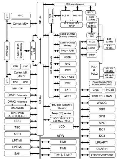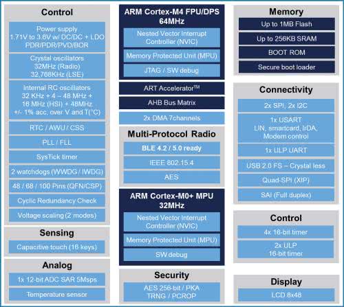 Nowy układ scalony serii STM32WB to praktycznie układ serii STM32L4 (z układami peryferyjnymi) z dodanym procesorem ARM Cortex M0+ oraz modułem radiowym. Oznacza to trzy autonomiczne podsystemy: