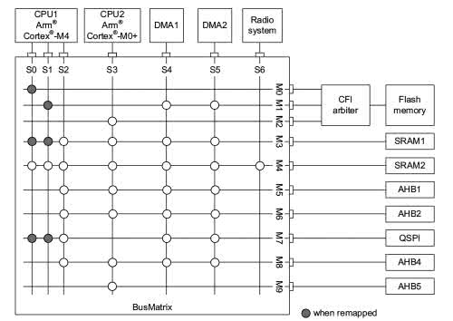 Układ scalony STM32WB55 jest zorganizowany wokół matrycy 32-bitowych magistral. Matryca zestawia połączenia pomiędzy modułami master oraz slave. Schemat takiej architektury jest pokazany na rysunku 4: