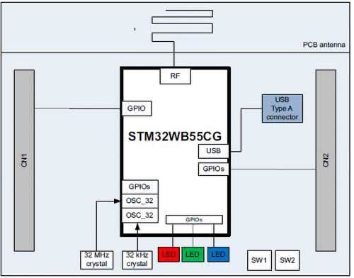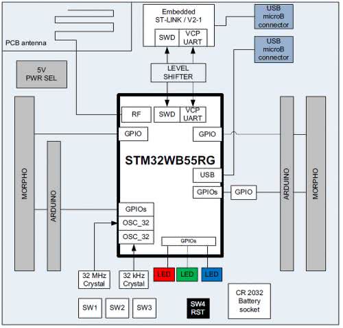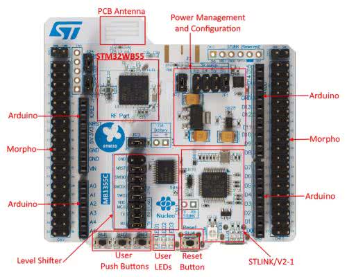 Złącza rozszerzeń. Na zewnętrznych krawędziach płytki drukowanej są zamontowane złącza CN7 i CN10 standardu ST-Morpho. Udostępniają one większość wyprowadzeń procesora STM32WB55RG oraz masę i zasilania. Po wewnętrznej stronie tych złączy są zamieszczone na płytce drukowanej złącza CN5, CN6, CN8 i CN9 standardu Arduino Uno V3. Gniazdko micro USB (CN15, „ST-LINK”) jest przeznaczone na obsługę debuggera i doprowadzenie zasilania. Gniazdko micro USB (CN1, „USB-USER”) jest dołączone do wyprowadzeń PA11 oraz PA12 procesora i jest przeznaczone na obsługę połączenia użytkownika. Na dole płytki drukowanej jest umieszczone gniazdko dla baterii CR2032.