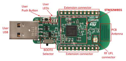 Zestaw uruchomieniowy P-NUCLEO-WB55 składa się z dwóch modułów sprzętowych: płytki „Nucleo-68” (MB1355C) oraz wtyczki USB “USB dongle” (MB1293C).