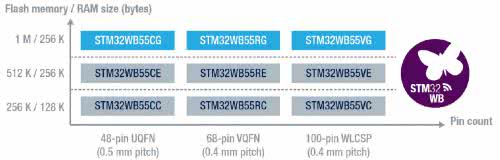 Układy scalone STM32WB55xx są oferowane w trzech rodzajach obudowy oraz z trzema pojemnościami pamięci Flash/RAM (rysunek 1). Rodzaj obudowy jest identyfikowany w nazwie układu pierwszą literką po numerze, gdzie: