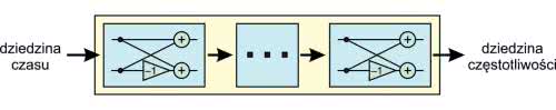 Nasza poprzednia implementacja FFT została schematycznie pokazana na rysunku 1. Do modułu napływają próbki w dziedzinie częstotliwości. Przepływają przez kolejne motylki, które są niemal identyczne. Różnią się długością opóźnienia oraz liczbą współczynników twiddle factor. Można jednak przyjąć, że wykonują one tą samą funkcję. Ma to nawet odzwierciedlenie w naszym kodzie, gdzie zostały wstawione za pomocą pętli for w bloku generate.