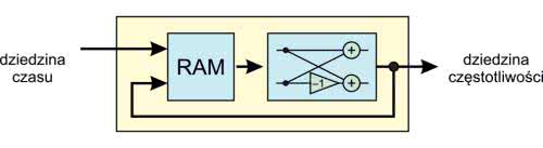 Dane wejściowe trafiają na multipleksery. Jeżeli moduł jest w stanie spoczynku zostaną one zapisane pod wskazany adres w pamięci RAM. Na razie zakładamy, że jest to pamięć idealna: po wpisaniu adresu wynik natychmiast pojawia się na wyjściu. W rzeczywistości wymaga to najczęściej kilku cykli zegara. Jednak na razie nie będziemy się tym przejmować. Tak jak poprzednio przez N oznaczymy długość transformaty. Łatwo więc zaobserwować, że będziemy potrzebować pamięci, która przechowa N zespolonych próbek. Gdy zostanie ona wypełniona danymi blok FFT zostanie o tym poinformowany poprzez wejście start.