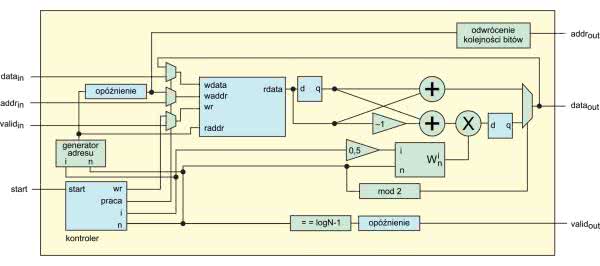 Wyjście z pamięci trafia bezpośrednio na motylka. Jednak tym razem na wejściu i wyjściu ma on tylko po jednym przerzutniku. Jak pamiętamy poprzednio długość tych opóźnień była zależna od kroku transformaty. Moglibyśmy próbować zrobić podobnie dodając blok opóźnienia o zmiennej długości sterowanej przez licznik n. Jednak możemy być sprytniejsi i zaoszczędzić dość dużo przerzutników kosztem skomplikowania generatora adresu. Tym razem nie działamy przepływowo, więc wszystkie dane są dostępne od razu. Dlatego możemy po prostu tak dobierać kolejne adresy, żeby na wyjściu z pamięci zawsze mieć dwie kolejne próbki z pojedynczego „motylka”.