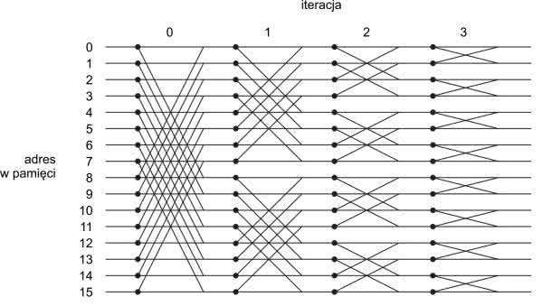 Odczytamy z niego jakie dane są potrzebne do kolejnych obliczeń. Każdy pionowy wiersz odpowiada komórce pamięci. Załóżmy, że na początku dane do pamięci będziemy wpisywać po kolei: próbkę z chwili 0 pod adresem zero, z chwili 1 pod 1 i tak aż do N–1. Rozważymy przypadek N=16.