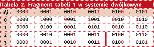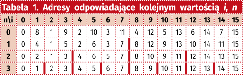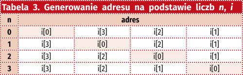 Na pierwszy rzut oka kolejne wartości wydają się dość przypadkowe. Ale popatrzmy na tabelę 2, gdzie zostały zapisane w systemie dwójkowym. Gdy się im przyjrzymy zauważymy, że można opracować łatwy przepis na otrzymanie adresu na podstawie współczynników n, i. Otóż wystarczy przesunąć najmłodszy bit na pozycję N-1-n. Został on zaznaczony czerwoną czcionką.