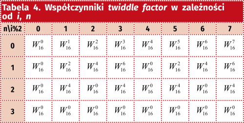 Wróćmy do naszego szczególnego przypadku N=16. W tabeli 4 pokazano jakie wartości są potrzebne dla kolejnych współczynników n, i. Ponieważ każdy motylek potrzebuje dwóch próbek, więc do wyboru współczynniki nie używamy najmłodszego bitu zmiennej i. Dlatego w tabeli pojawia się i modulo 2. Po chwili analizy możemy zapisać potrzebny adres jako: