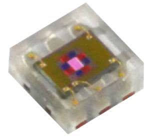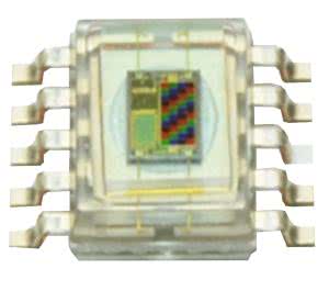 Firma Hamamatsu produkuje dwa układy scalone z interfejsem I2C i z tym samym sensorem RGB [5]. Sensor ma rozmiary 1,1×0,54 mm i jest zorganizowany w postaci matrycy: cztery pola RGBC powtórzone 10 razy (fotografia 7).