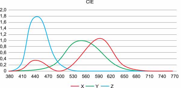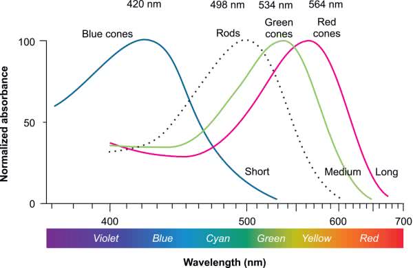 Ludzkie oko jest zbudowane z trzech rodzajów czopków (cones) czułych na różną długość fal: długich 560...580 nm (L), średnich 530...540 nm (M) i krótkich 420...440 nm (S). Dają one percepcję kolorów przez człowieka w warunkach średniej i dużej jasności (rysunek 1).