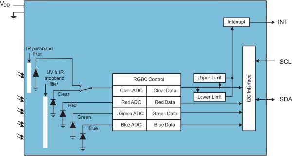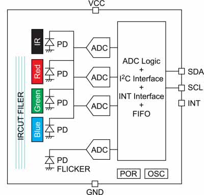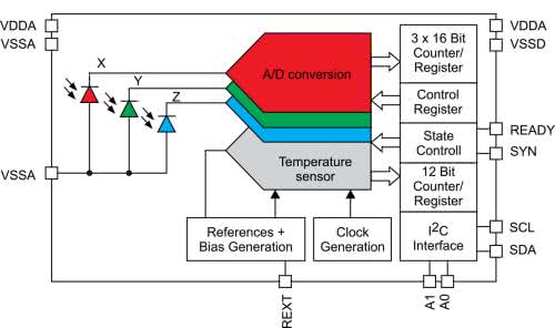 Duża czułość (do 0,015 lux/zliczenie), szeroki zakres dynamiczny (do 50 klux) i doskonałe właściwości wbudowanego filtra podczerwieni umożliwiają temu układowi scalonemu dokładne pomiary natężenia oświetlenia i temperatury barwowej światła otoczenia. Układ zawiera 5 fotodiod dołączonych do 4 przetworników AC (16b) (rysunek 11).