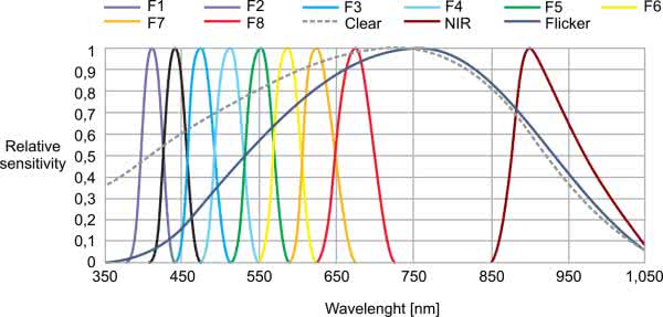 Odpowiedź widmową definiuje w zakresie długości fal od około 350 nm do 1000 nm. Sześć kanałów może być przetwarzanych równolegle przez niezależne przetworniki ADC, podczas gdy inne kanały są dostępne za pośrednictwem multipleksera. Osiem kanałów optycznych obejmuje widmo widzialne, jeden kanał może służyć do pomiaru bliskiej podczerwieni, a jeden kanał to fotodioda bez filtra – „czysta”. Urządzenie ma również dedykowany kanał do wykrywania migotania światła otoczenia 50 lub 60 Hz. Mechanizm wykrywania migotania może również buforować dane do obliczania innych częstotliwości migotania. Kanał NIR w połączeniu z innym kanałem VIS może dostarczać informacji o otaczających warunkach oświetleniowych (wykrywanie źródła światła).
