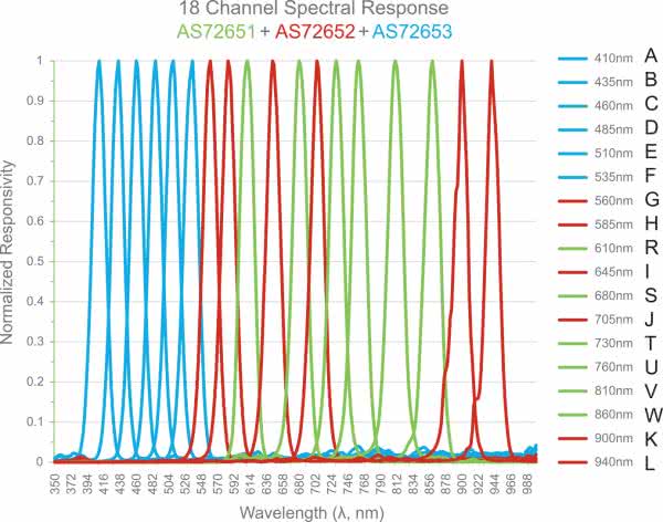 Dostarczają one 18-kanałową, matrycę czujnikową obejmującą długości fal bliskiego nadfioletu do bliskiej podczerwieni (410...940 nm) z szerokością kanałów FWHM 20 nm (rysunek 6).