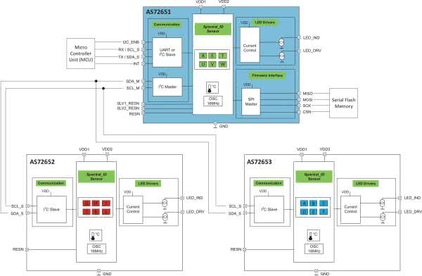 - AS72651 (610, 680, 730, 760, 810, 860 nm) – służy jako główny kontroler zestawu. Wymaga dołączenia zewnętrznej pamięci Flash z firmowym oprogramowaniem. Port UART służy do komunikacji z systemem komputerowym.