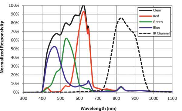 Scalone układy czujników RGB wykonują pomiar w trzech zakresach widma światła: czerwony (R) 590...720 nm, zielony (G) 480...600 nm oraz niebieski (B) 400...540 nm. Czujniki koloru zawierają typowo filtry blokujące niepożądane światło podczerwone. Niektóre czujniki wykonują dodatkowo pomiar w zakresie podczerwieni (IR) powyżej 700 nm oraz pomiar całego widma światła (C), bez filtru kolorowego.