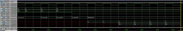 Na samym końcu mamy odczyt. Odpowiednie słowo zostaje wybrane z pamięci i wpisane na wyjście. Widzimy więc, że wybrane dane znajdują się na wyjściu na drugim cyklu zegara po pojawieniu się adresu na wejściu.