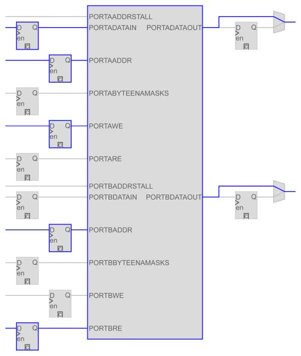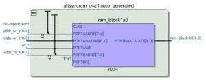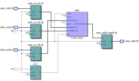 Na rysunku 2 został zaprezentowany moduł RAM w widoku RTL. Widzimy tu rejestry na wejściach i wyjściach. Natomiast w środku mamy moduł SYNC_RAM. Widzimy więc, że środowisko poprawnie zinterpretowało nasz kod i wygenerowało blok pamięci RAM.