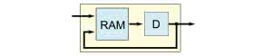 Musimy jeszcze zastanowić się nad latencją. Uproszczony model naszego procesora został pokazany na rysunku 5. W poprzedniej części analizowaliśmy przypadek, gdy latencja obliczeń pomiędzy odczytem i zapisem do RAM-u była zerowa. W praktyce jednak zarówno dostęp do pamięci, jak i wykonywanie działań wymaga kilku cykli zegara. Na rysunku reprezentuje je blok z literą D. W naszym przypadku latencja jest równa 6. Oznacza to, że tyle cykli zegara minie zanim nowa wartość zostanie zapisana do pamięci. Dla naszej implementacji oznacza to, że dopiero po tym czasie kolejna iteracja obliczeń będzie mogła sięgnąć ponownie do tej samej komórki pamięci. Aby to zapewnić minimalna długość naszej transformaty wynosi 16. I taka też jest użyta w testbenchu 14_iterative_fft/fft_iter_tb.sv. Uruchamiamy go rozkazem: