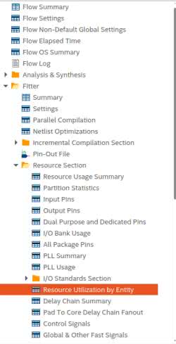 Na koniec porównamy jeszcze zużycie zasobów pomiędzy naszymi dwoma implementacjami FFT. Skorzystamy z raportu o liczbie elementów wykorzystywanych przez poszczególne komponenty. Jak widzimy na rysunku 6 znajdziemy go w zakładce Fitter/Resource Section/Resource Utilization by Entity. Zebrane wyniki widzimy w tabeli 1.