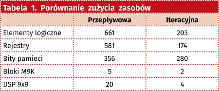 Wersja iteracyjna wymaga ponad trzykrotnie mniej elementów logicznych. Zużycie pamięci jest mniejsze o ponad połowę. Największą oszczędność mamy jednak w mnożarkach, gdzie używamy ich tylko 4 zamiast 20.