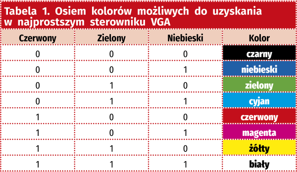 Jak widzimy na rysunku 2 ustawienie stanu wysokiego spowoduje wygenerowanie napięcia 0,6 V. W ten sposób otrzymaliśmy najprostszy sterownik portu VGA. Ponieważ każdy z naszych trzech „przetworników cyfrowo-analogowych” ma rozdzielczość jednego bita, możemy otrzymać tylko osiem różnych kolorów. Ich lista została pokazana w tabeli 1 [1].