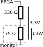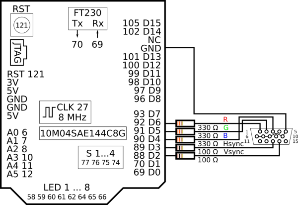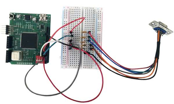 Interfejs funkcjonuje w formie złącza DB15. Sposób podłączenia do płytki Rysino został pokazany na rysunku 1. Sygnały synchronizacji łączymy przez dodatkowe rezystory o oporze 100 Ω, które zabezpieczają wyjścia układu FPGA. Ważniejszą rolę pełnią oporniki na liniach z sygnałem kolorów. Razem z rezystorem wbudowanym w monitor tworzą one dzielniki napięcia.