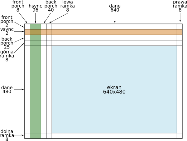Pierwsze osiem pikseli w wierszu to tak zwany front porch. Następnie przez 96 pikseli następuje przesłanie sygnału synchronizacji, czyli podania stanu niskiego na linię Hsync. Dalej następuje 40 pikseli back porch oraz 8 pikseli lewej ramki. Dopiero teraz możemy przesłać pojedynczy wiersz, czyli 640 pikseli obrazu. Na końcu mamy jeszcze 8 pikseli prawej ramki [2].