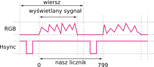 Znamy już kształt przebiegów. Brakuje nam jeszcze ostatniego fragmentu układanki: czasu trwania. Będziemy wyświetlać 60 ramek na sekundę. Oznacza to, że częstotliwość zegara będzie wynosiła 60·800·525, czyli 25,2 MHz.