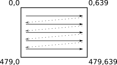 Sygnał RGB obrazuje zmiany sygnału analogowego na liniach kolorów, natomiast Hsync jest sygnałem synchronizacji. Zarówno ramka jak i porch nie są dla nas istotne. Musimy jedynie wiedzieć kiedy możemy nadawać dane oraz kiedy musimy wywołać sygnał synchronizacji. Aby ułatwić sobie pracę możemy „przesunąć” nasz licznik, aby wartość 0 oznaczała rozpoczęcie właściwych danych. Gdy ten sam trik z przesunięciem licznika zastosujemy dla osi pionowej, wtedy kolejne piksele będą miały pozycję taką jak pokazano na rysunku 5.
