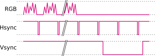 Wiemy już jak kodowane są kolory. Jednak monitor musi wiedzieć, do którego piksela odnoszą się kolejne dane. Możliwe jest to dzięki sygnałom synchronizującym. Naszym celem będzie wyświetlenie obrazu o rozdzielczości 640×480, jednak z przyczyn historycznych sygnał musi zawierać dodatkowe przerwy (były niezbędne dla prawidłowej pracy starych monitorów typu CRT). Dlatego przesyłane dane odpowiadają rozdzielczości 800×525 ale tylko część tego obszaru jest aktywna, tak jak to zostało pokazane na rysunku 3.