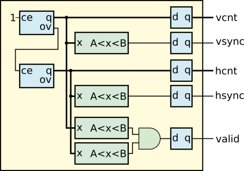 Schemat pierwszej z nich został pokazany na rysunku 7. Jak widzimy jest on zaskakująco prosty. Sercem są dwa liczniki. Pierwszy z nich zliczający modulo 800 odpowiada za zliczanie kolumn, a drugi modulo 525 za zliczanie wierszy. Następnie mamy kilka bloków logiki kombinacyjnej. Sprawdzamy tu, czy wartość licznika mieści się w zadanym zakresie. Na tej podstawie generujemy sygnały synchronizacji. Dodatkowo wytwarzamy pomocniczy sygnał valid. Będzie on miał stan wysoki wtedy, gdy pracujemy na pikselu będącym częścią wyświetlanego obrazu. Na końcu umieszczamy jeszcze przerzutniki zatrzaskujące stan wyjść modułu.