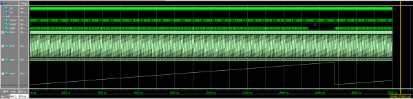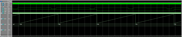 Widzimy tu fragment blisko końca ramki (co poznajemy po stanie niskim na Vsync). Z tego powodu sygnał valid nie jest ustawiony. Możemy się jednak przyjrzeć jak wygląda licznik hcnt zmieniający się od 0 do 799 oraz zobaczyć działanie sygnału Hsync.