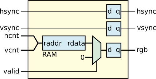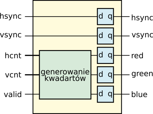 Schemat blokowy takiego modułu został pokazany na rysunku 11. Widzimy tu logikę kombinacyjną, która na podstawie sygnałów hcnt, vcnt oraz valid generuje trzy składowe kolorów: r, g i b. Na końcu mamy rejestry zatrzaskujące wyjścia. Zwróćmy uwagę, że wszystkie sygnały muszą mieć takie same opóźnienie, dlatego musimy dodać przerzutniki, także dla sygnałów synchronizacyjnych.