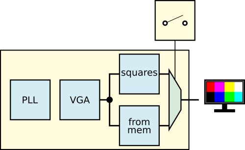Teraz możemy dołączyć nasz moduł do głównego projektu. Prezentuje to schemat z rysunku 17. Umieszczamy go równolegle z generatorem kwadratów. Oba przyjmują to samo wejście z generatora sygnału synchronizacyjnego. Następnie za blokami umieszczamy multiplekser. Będziemy nim sterować z przełącznika dip-switch, który znajduje się na płytce. Dzięki temu będziemy mogli przełączać się pomiędzy dwoma obrazami.