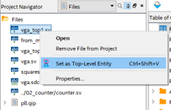 Wynik jest podobny do tego z poprzedniej symulacji, więc nie będę go tu zamieszczał. Za to przejdziemy do testów ze sprzętem. Najpierw w środowisku Quartus musimy zmienić moduł główny na vga_top1.sv (rysunek 18). W tym celu w panelu Project Navigator przechodzimy do zakładki Files. Klikamy prawym przyciskiem myszy na vga_top1.sv i z menu kontekstowego wybieramy Set as Top-Level Entity.