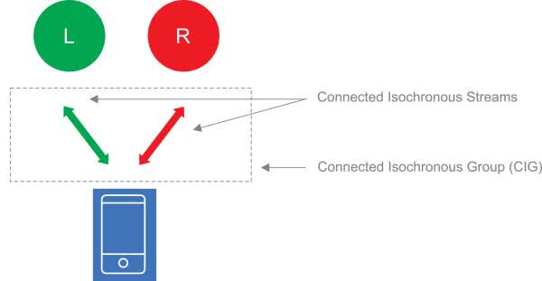 Strumienie CIS (Connected Isochronous Stream) obsługują transmisję dwukierunkową (rysunek 1). Są członkami grup nazywanych CIG (Connected Isochronous Groups). Maksymalna liczba CIS w CIG wynosi 31. Urządzenie, które zostało zsynchronizowane z BIG, nazywa się zsynchronizowanym odbiornikiem. Gdy to urządzenie rozpocznie synchronizację BIG, należy skonfigurować parametr limitu czasu synchronizacji BIG, który określa maksymalny dozwolony czas pomiędzy udanymi transmisjami.