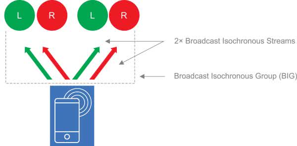 Strumienie BIS (Broadcast Isochronous Streams) obsługują tylko transmisję jednokierunkową (rysunek 2). Są członkami grup nazywanych BIG (Broadcast Isochronous Group). Każdy BIS przesyła identyczną kopię danych (lub sterowań) do urządzeń odbiorczych. W ramach grupy kanały CIS (lub BIS) mają takie same parametry czasowe użyte do synchronizacji izochronicznego przetwarzania danych (typowo dźwięku) przez wszystkie odbiorniki w grupie. Urządzenie centralne (master) może tworzyć wiele grup CIG (lub BIG).
