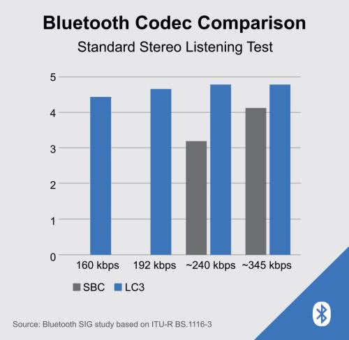 Obsługa LC3 poprawia jakość dźwięku, zapewniając jednocześnie lepszą obsługę odsłuchu w środowiskach o niskiej przepustowości. Rozległe testy odsłuchowe wykazały, że ogólna jakość odsłuchu przy użyciu LC3 jest lepsza niż istniejącego kodeka SBC (Classic Audio) – nawet przy przepustowości pasma niższej o 50% niż obsługiwana przez Classic Audio (rysunek 3). W skali gdzie 5 to najlepsza jakość, LE Audio wypada dobrze nawet dla małej przepustowości.