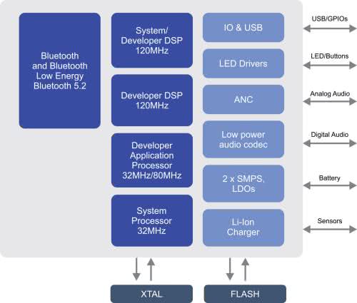 Podstawowe układy serii QCC5100 (rysunek 4) mają dwa rdzenie procesorowe aplikacyjne 32-bitowe (do 80 MHz) oraz dwa rdzenie DSP (2...120 MHz).