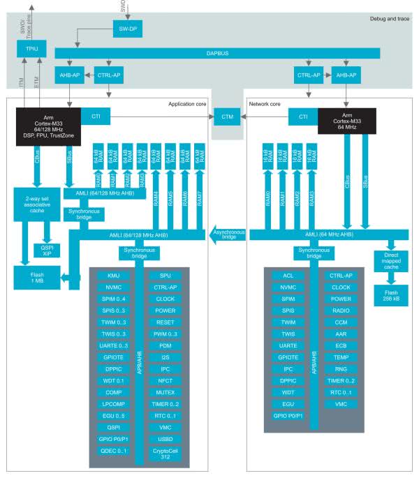 Schemat blokowy procesora nRF5340 został pokazany na rysunku 6. Rdzeń aplikacyjny ARM Cortex-M33 zapewnia energooszczędną arytmetykę (DSP), obliczenia zmiennoprzecinkowe (FPU), kontroler przerwań (NVIC) oraz moduł ochrony pamięci (MPU). Może pracować z obniżoną częstotliwością zegara ze 128 MHz do 64 MHz (przy użyciu skalowania napięcia i częstotliwości) co pozwala na zmniejszenie mocy zasilania (510/255 CoreMark, 65/76 CoreMark/mA). Ma dołączoną pamięć Flash (1 MB), RAM (512 kB) oraz 8 kB 2-drożnej asocjacyjnej pamięci podręcznej.