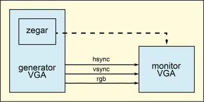 Jesteśmy już gotowi do implementacji naszego dzisiejszego projektu – monitora VGA. Na rysunku 4 zostało pokazuje jego połączenie z generatorem sygnału VGA (przygotowanym w poprzednim odcinku). Stosujemy tu małe oszustwo. Oryginalny sygnał VGA nie ma zegara, numer kolumny należy odzyskać na podstawie odstępów pomiędzy kolejnymi sygnałami hsync.