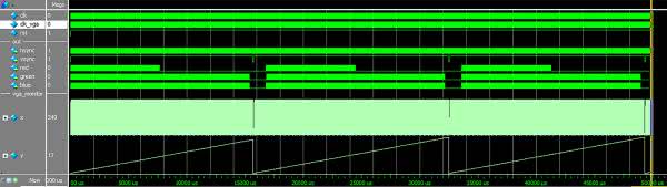 Jest on klasyczny: po prostu łączymy wyjścia z wejściem. Warto tu zwrócić uwagę na notację dut.clk_vga, za pomocą której uzyskujemy dostęp do sygnałów z wnętrza modułu dut. Symulację uruchamiamy rozkazem:
